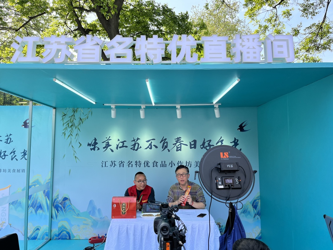 除了线下展销,在现场,记者看到了正在热火朝天搞直播的“江苏省名特优直播间”,打头阵的直播产品是徐州的“樊响”扦子。直播间负责人告诉记者:“展销会一共3天,每天安排19家作坊直播,直播时主办方还配备了专业的主持人。通过直播进行食品小作坊美食线上推广,让未能到场的观众也能够实时感受到名特优食品小作坊食品的诱人美味,并能在线上下单购买。直播刚开始,观众已经超过1万人。”