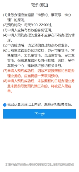 1、预约须知,勾选“我已认证阅读以上内容,愿意承担相关责任。”,点击下一步按钮。
