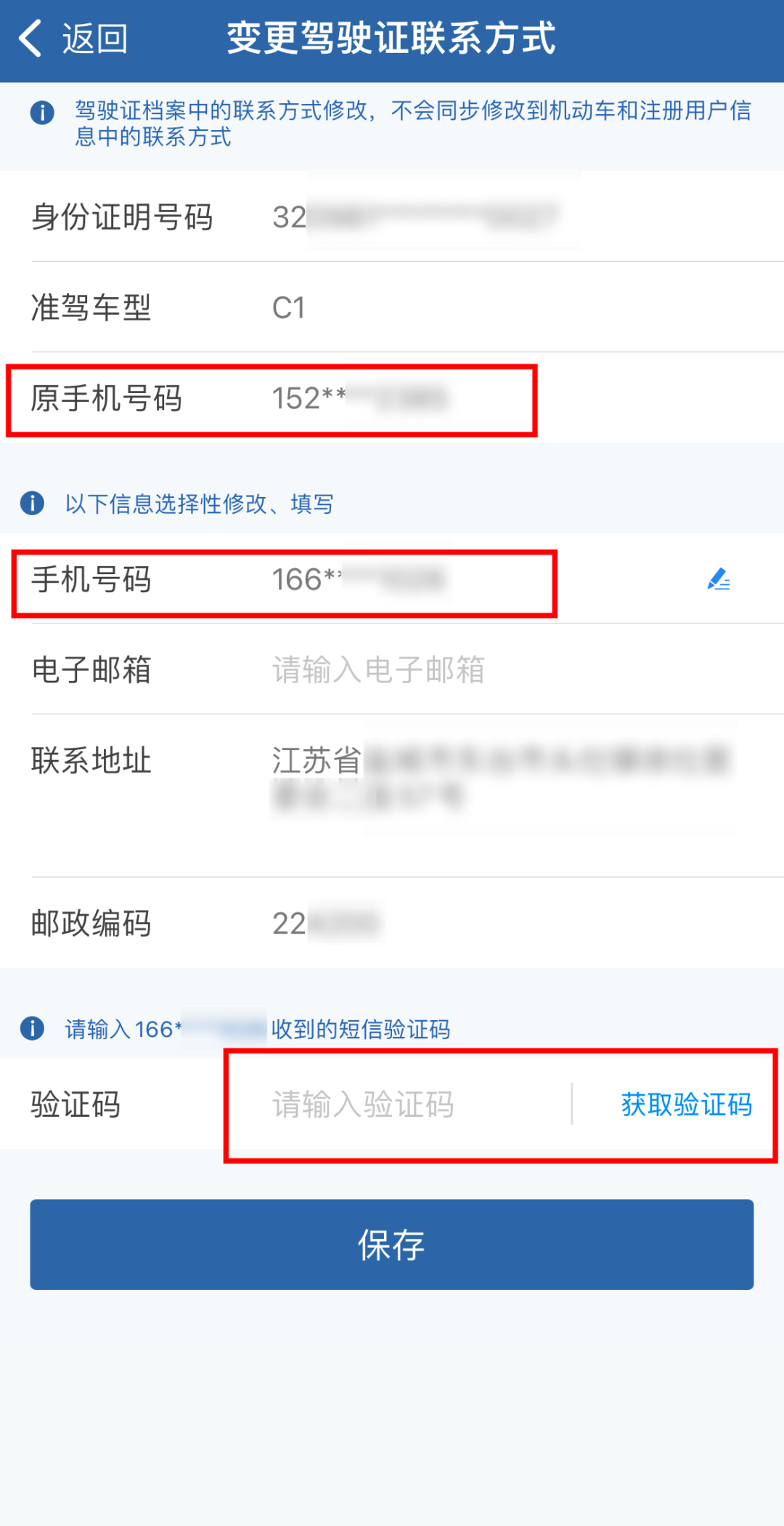 4.在变更驾驶证联系方式页面填写新的手机号码以及验证码;