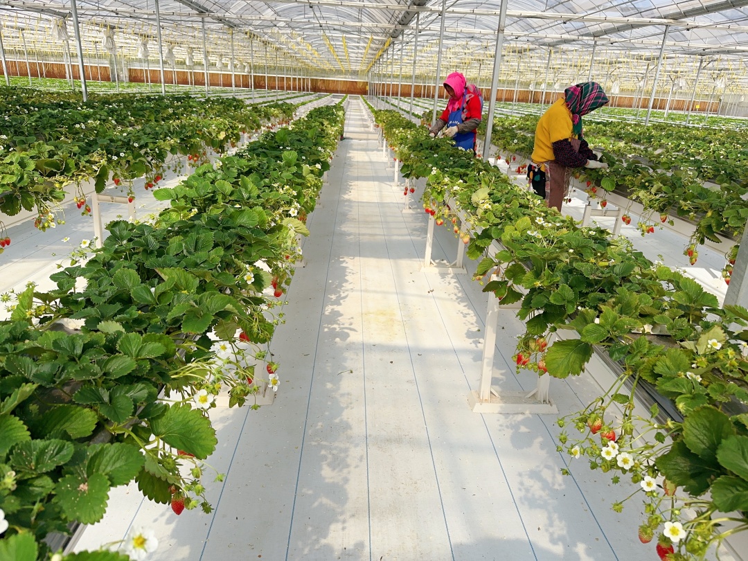得益于数字技术的应用,眼前这片总面积10827平方米的未来数字农场里安装了各类传感器,可24小时全天候在线监测大棚环境的波动情况,这里温度、湿度、光照一年四季都保持在最合理的范围区间。每一排培养基里都有探针,可以实时监测土壤里的湿度、温度以及有机肥含量、氮磷钾比例,给予作物最合理的营养“大餐”。同时,有了智慧化的集成系统,浇水、施肥这些农活也不需要人工操作,都由系统自动完成。“通过数字赋能,大大减少了工人使用,原本这么一个大棚,至少需要10个工人,现在4个人负责日常的巡视、维护、管理已经完全足够。”陆师球介绍,数字化、标准化的种植,给作物提供了最佳生长环境,也为引进、示范、推广果蔬新品种提供了条件。比如,农场当前引进种植的隋珠草莓、情怀红豆樱桃番茄都是市场前景非常看好的果蔬新品,采摘上市后广受好评,很受市场欢迎。