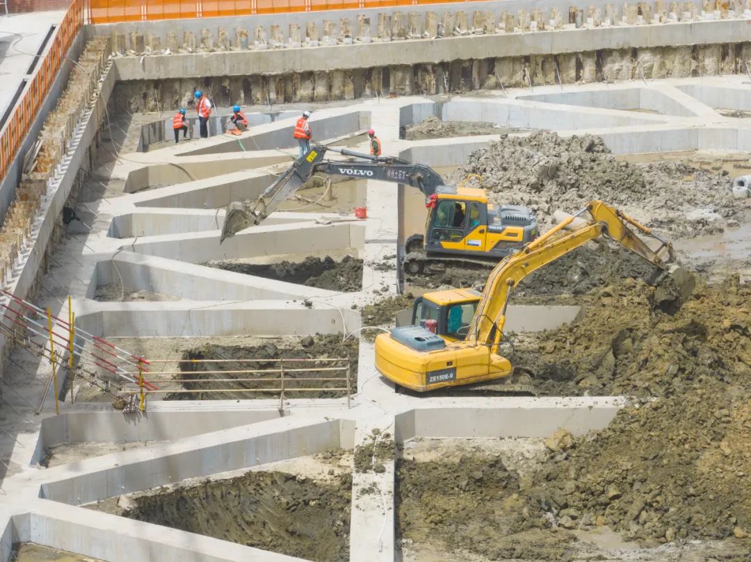 项目施工现场,挖掘机正火力全开推进土石方开挖,工人们正在紧张作业。远处,一台台吊机将施工所需的钢筋材料源源不断运输至场地内。现场机器轰鸣,一派繁忙景象。
