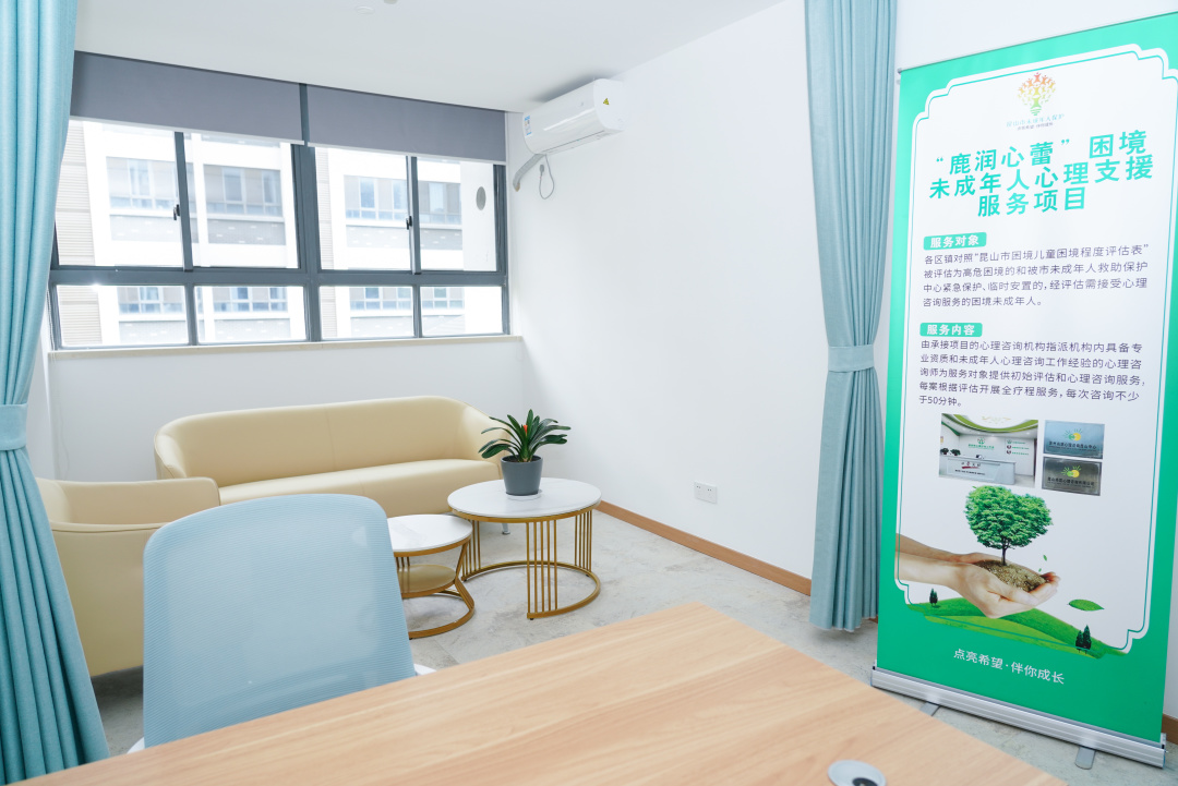 康乐室是给孩子们提供娱乐健身的场所;心理室主要依托昆山“鹿润心蕾”未成年人心理服务项目,对入住的困境儿童、高危儿童提供免费的心理服务。此外,如有突发困境的未成年人入住,中心会有相应的护工、社工和心理咨询师等综合性团队对孩子进行服务。