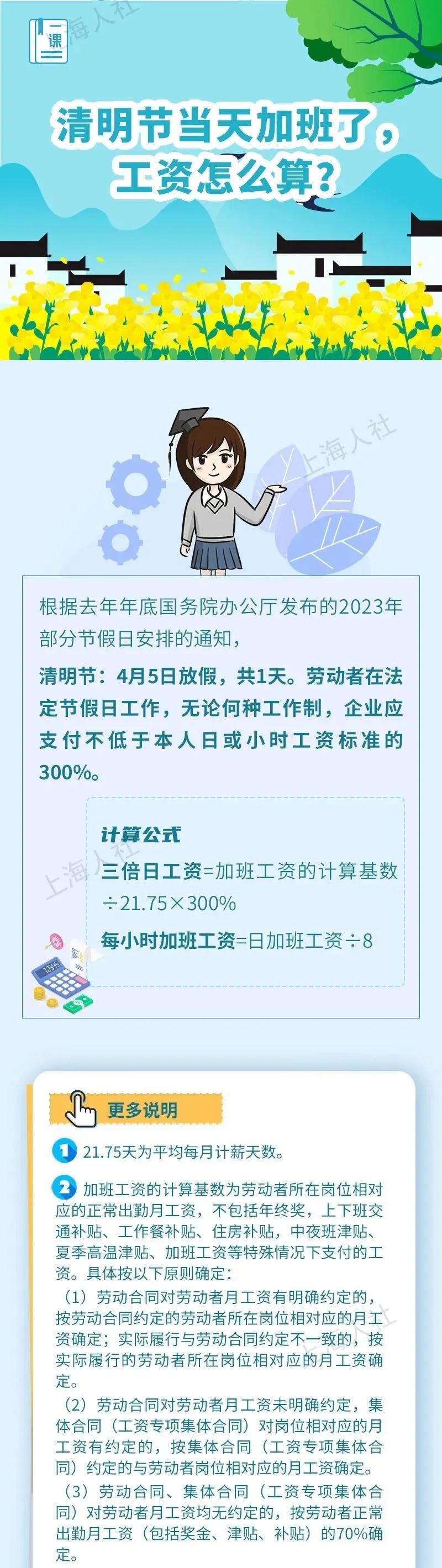 法定节假日加班工资=月工资基数÷21.75天×300%×加班天数