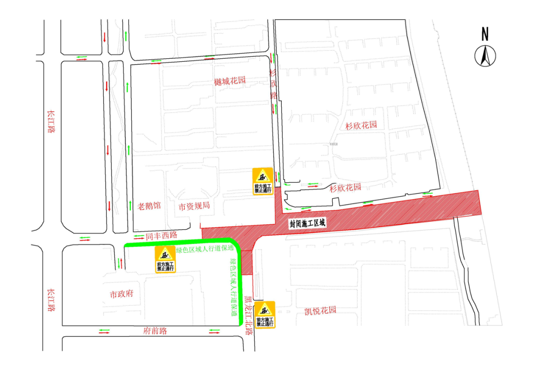 4. 同丰西路自西向东,由市自然资源和规划局门口向东,主车道全封闭施工,预留南侧人行通道方便市民出行。