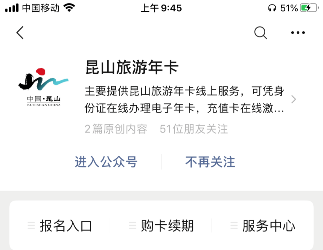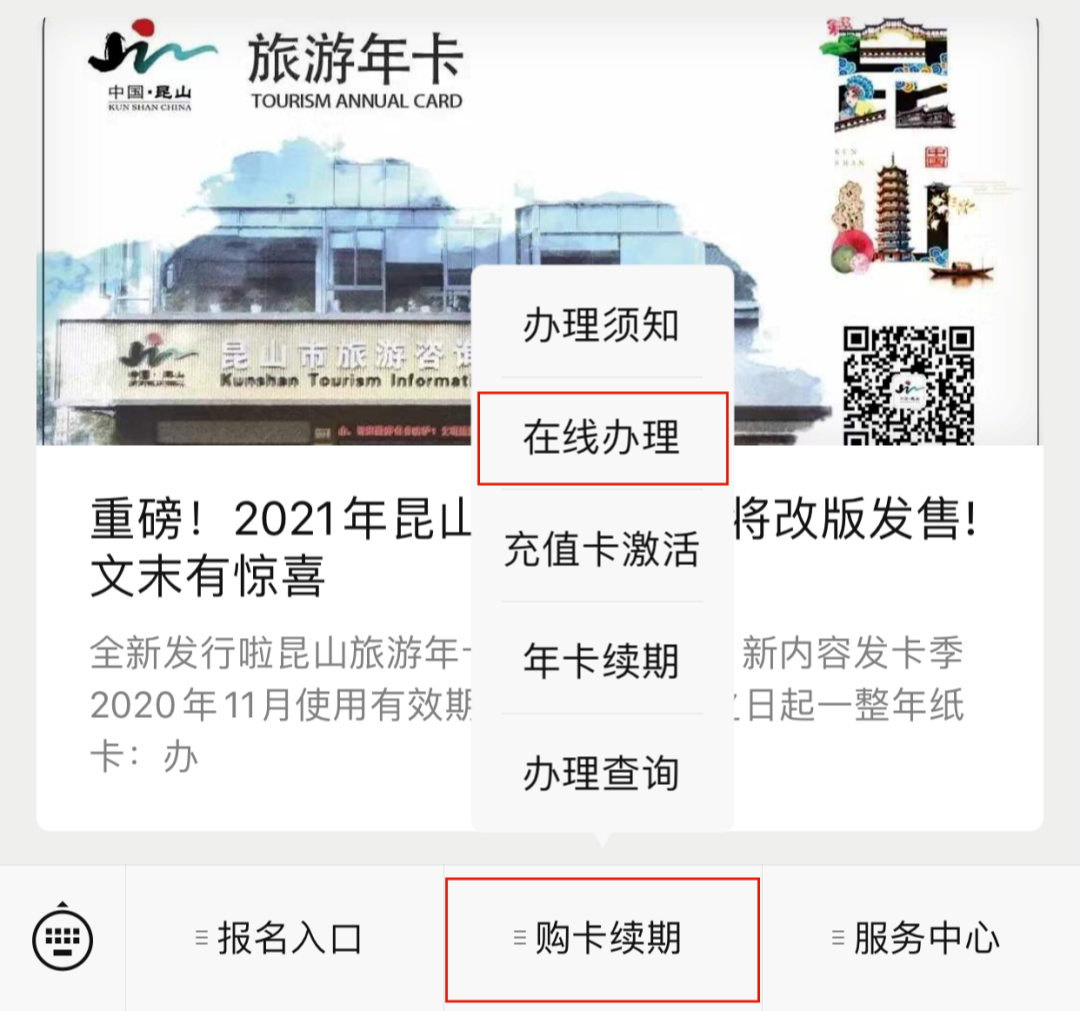 第一步:微信公众号搜索“昆山旅游年卡”,进入公众号,选择“购卡续期——在线办理”。