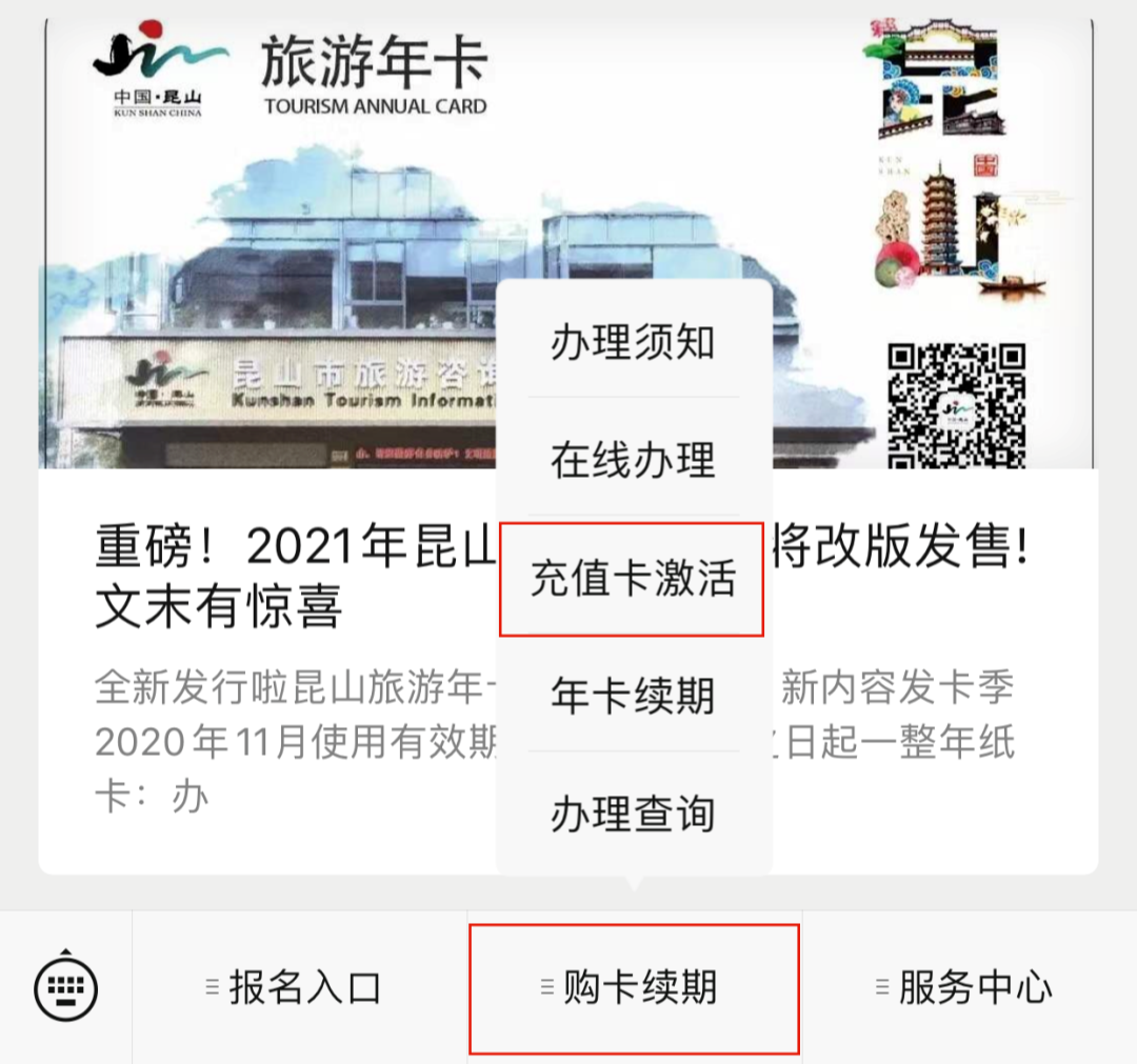 充值卡线上激活:微信公众号搜索“昆山旅游年卡”,进入公众号,选择购卡续期---充值卡激活---输入充值卡序列号和密码---填写个人资料并上传个人照片(照片须为个人手机自拍近期免冠照片)及身份证正反面---审核通过以后凭身份证入园(次日生效)。