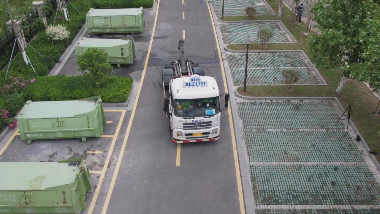 在江南平安里小区的围栏外,绿色的建筑垃圾移动收集箱十分显眼,箱体配备GPS定位、容量自动监测系统等功能,实现箱满即运。同时,通过专业的建筑垃圾运输勾臂车,“一勾一放”中即可实现“空箱换满箱”。