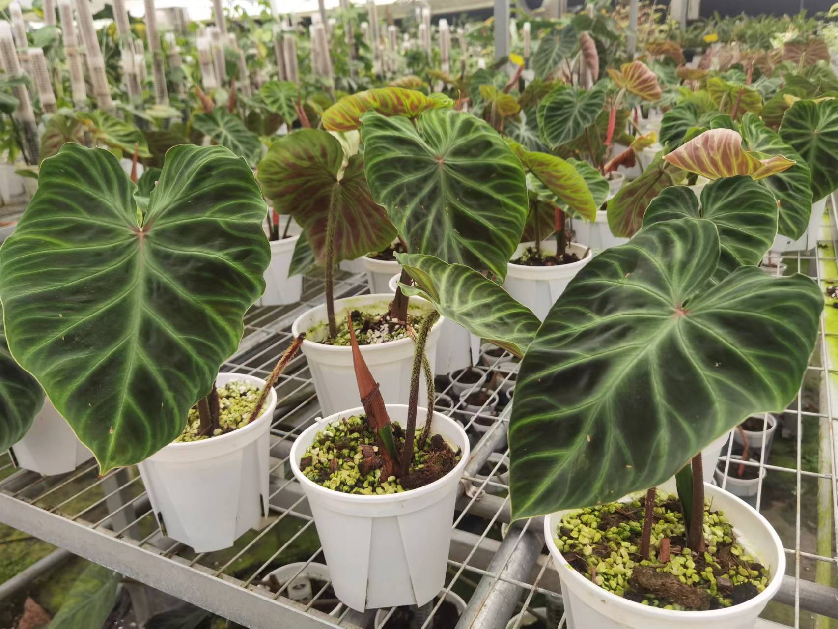 当年创业时,热带绿植的培育和种植在国内很少,他们两个就通过国外网站学习了解,还经常出国进行考察。公司成立之初,建立了一家工作室从泰国引种,一边积累种养经验,一边开始通过网络进行销售,组建花友群,培育产品品牌。2019年,纵野在千灯建立生产基地,开始自主杂交繁育。短短几年间,纵野由一个小工作室发展为目前6000余平米的规模基地,公司每年培育的新品种不低于20个,栽培的花烛属、蔓绿绒属、龟背竹属、合果芋属、海芋属等科属种类已过100种。