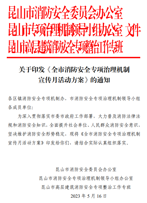 根据《全市消防安全专项治理机制宣传月活动方案》(以下简称《方案》)要求,即日起至6月,我市全面启动消防安全专项治理机制宣传月活动,进一步深入学习贯彻党的二十大精神和习近平总书记关于安全生产和消防安全的重要指示精神,严格落实国务院、省、苏州和市委市政府关于消防安全工作的各项部署要求,大力普及消防法律法规和消防安全知识,全面提升社会单位、人民群众消防安全意识和逃生自救能力,坚决维护消防安全形势稳定。