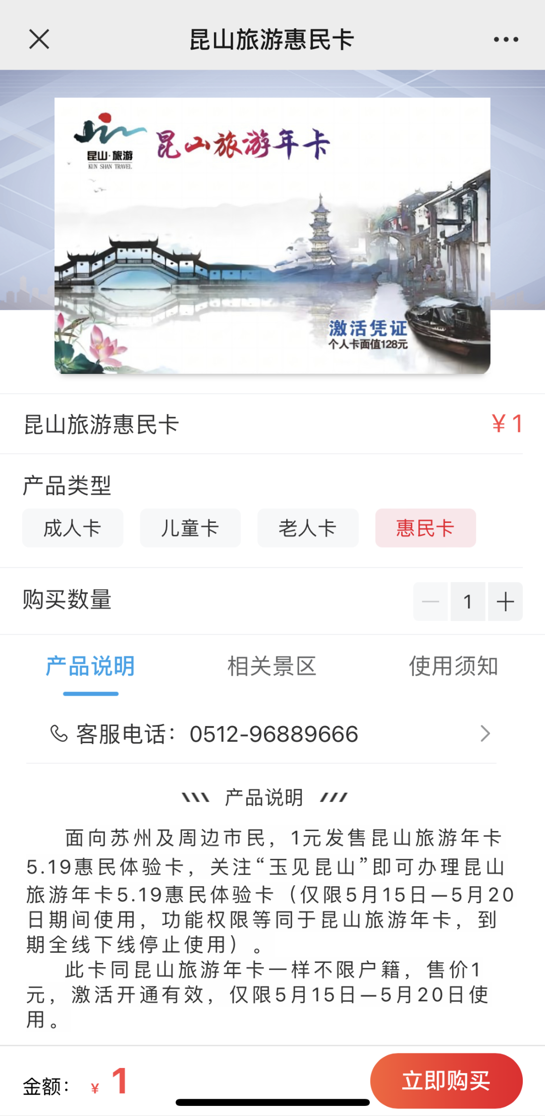 面向苏州及周边市民,同昆山旅游年卡一样不限户籍,售价1元,激活开通有效,仅限5月15日至5月20日期间使用,功能权限等同于昆山旅游年卡,到期全线下线停止使用。