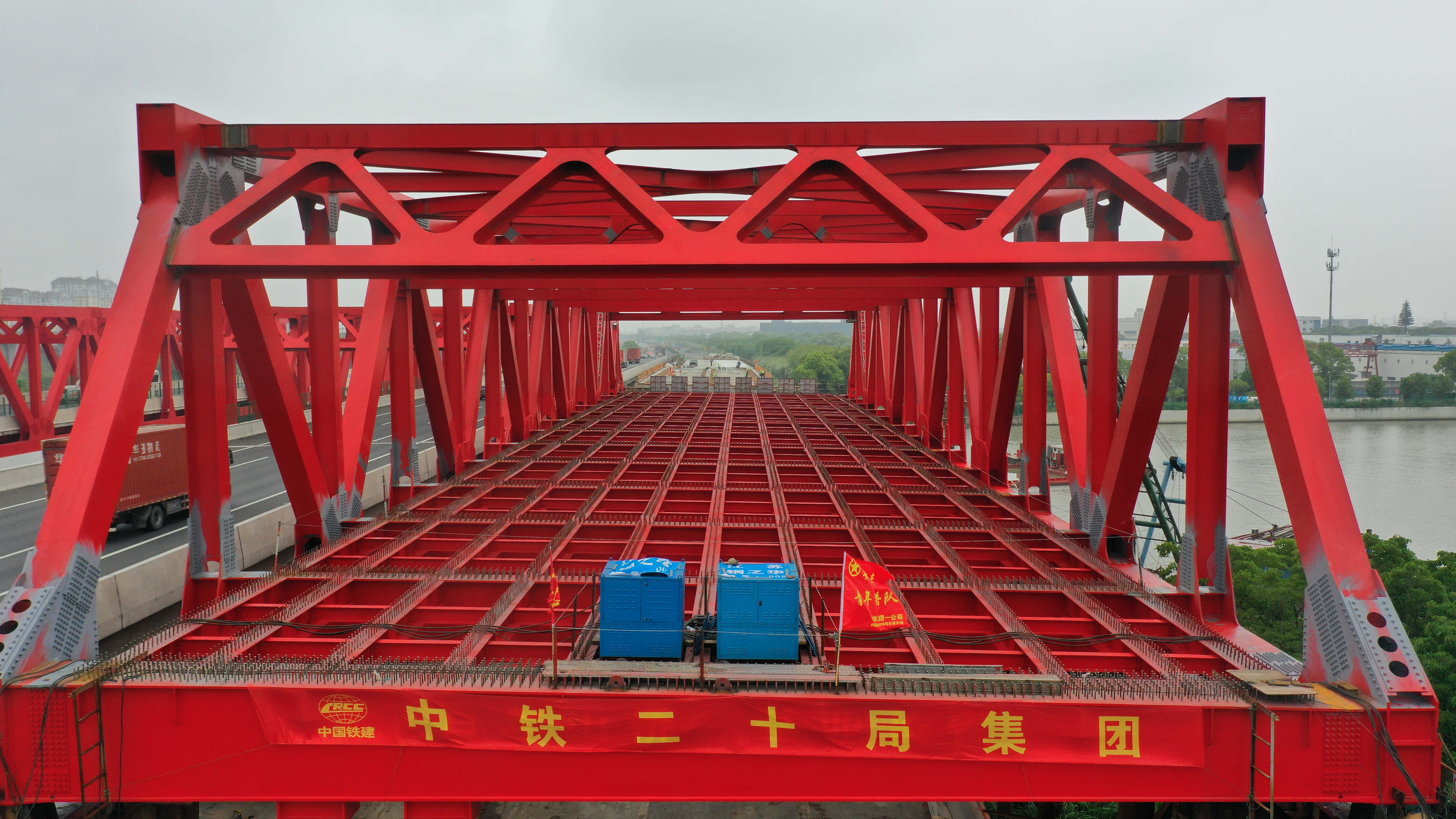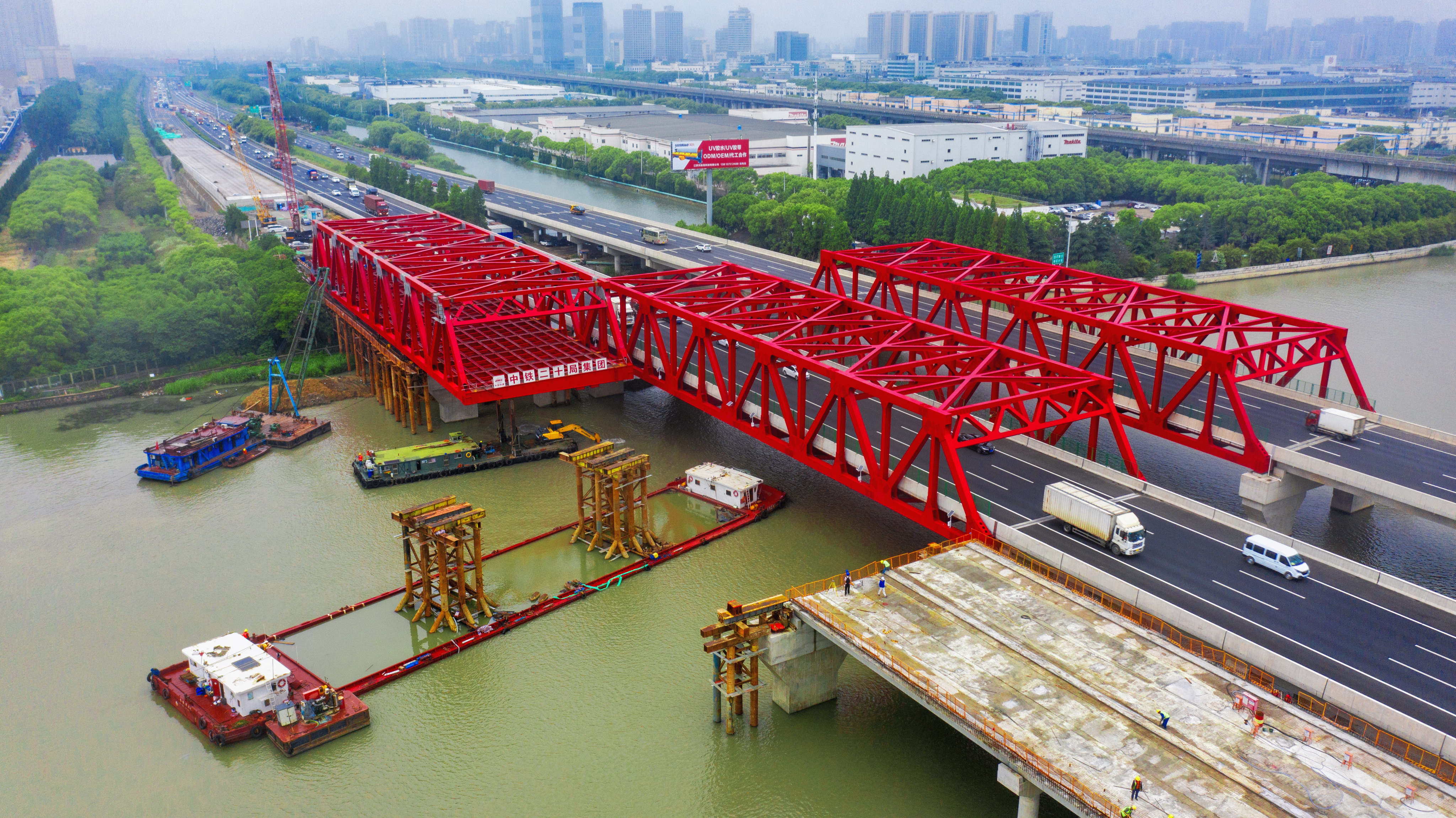 沪宁高速公路跨青阳港大桥南半幅钢桁梁完成顶推!今年9月底将全线通车