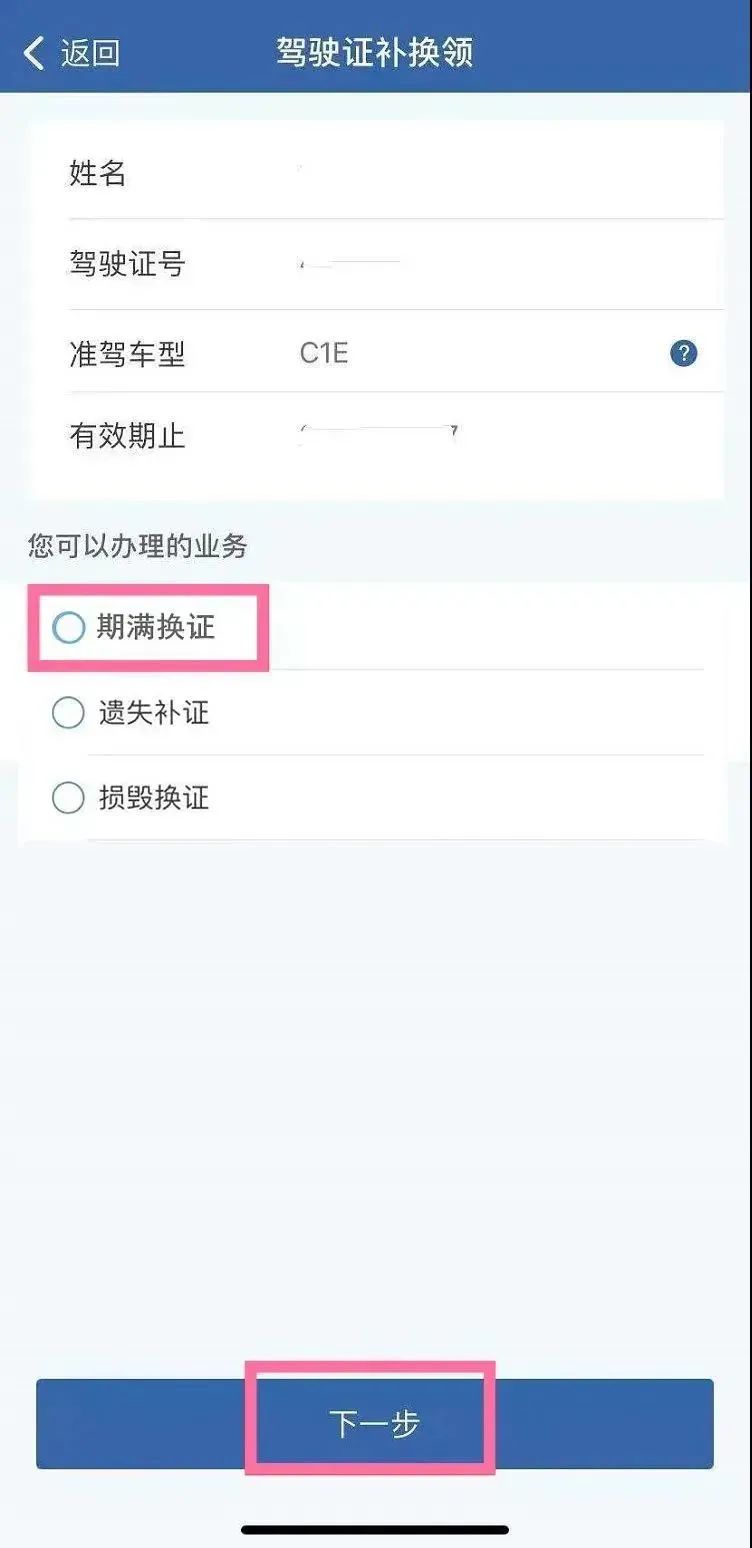 2.系统会根据你的驾驶证实际情况,筛选出可办理的业务类型供勾选;选择【期满换证】后点击【下一步】。