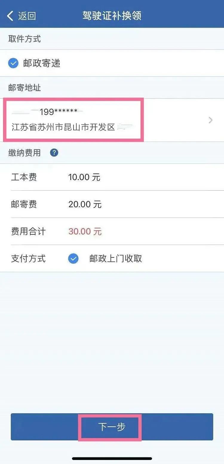 4.填写驾驶证邮寄地址(全国均可邮寄)及联系电话,点击【下一步】。
