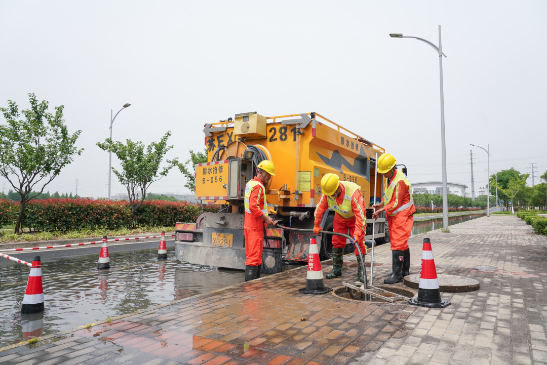 下午1点,演练正式开始,模拟场景为汛期来临,突发强降雨导致路面道路积水严重,影响车辆、行人通行的情况。指挥中心接到汛情后,立刻启动突发事件应急响应机制。应急抢险工作人员第一时间到达现场,摆放锥形桶、道路警示牌,引导周边车辆有序通行。抢险组工作人员安排大功率排水车,应急渣浆泵,管道疏通车等进行应急排险。经过近一小时奋战,路面积水基本排完,疏浚沟渠、清洗路面后,应急响应解除,道路恢复通行。“演练以实战为导向,设置了具体演练场景,备齐了演练装备,达到了真实、真练、真提高的演练目标。”昆山琨澄排水工程有限公司2023年排水管网养护及检测工程项目经理王晓勇说。