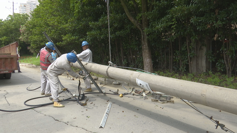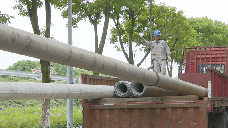 在世茂蝶湖湾小区东门口,一名工人正沿着电线杆向上攀岩,一旁的吊车缓缓伸出吊臂,工人攀爬到合适高度后,将吊臂上的套索固定在电线杆上,随后吊车驾驶员操纵吊臂小幅摇晃,再向上提起。几分钟后,在轰鸣声中,一根15米左右的电线杆便离地了。