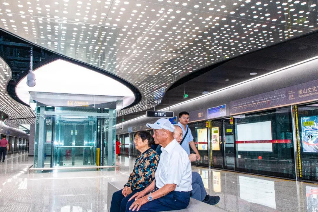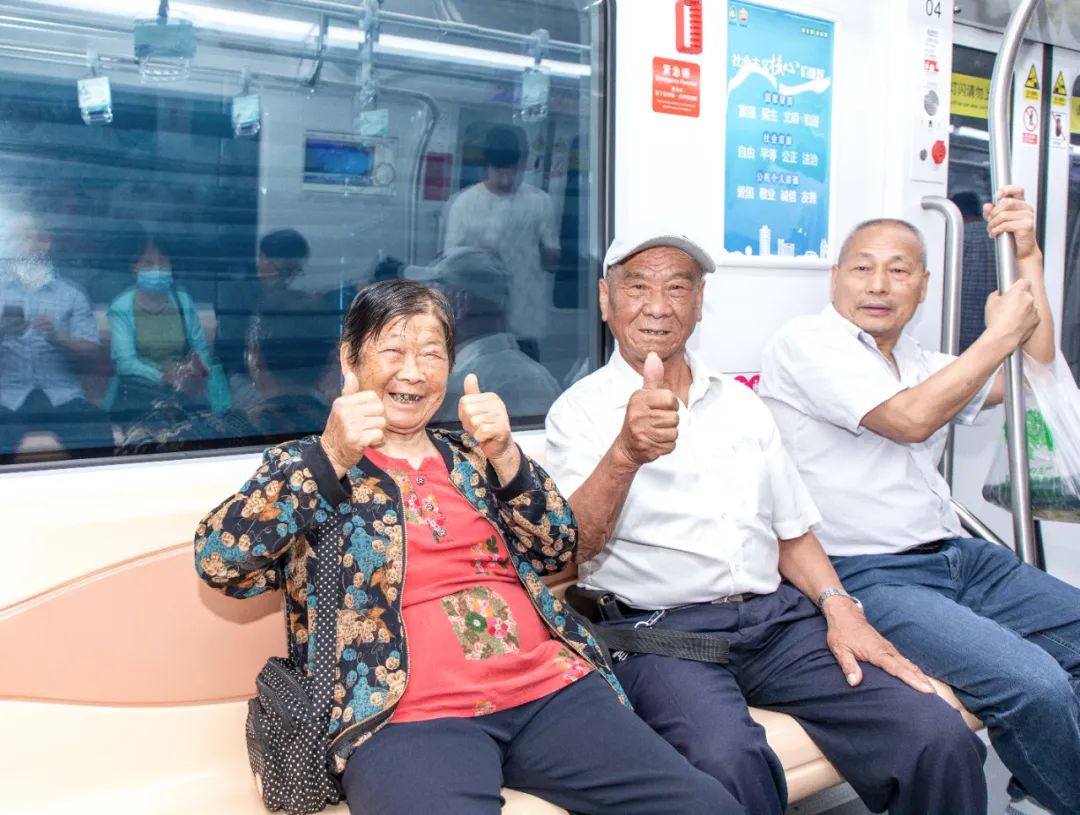 两位老人乘坐轨交欣赏站点美景