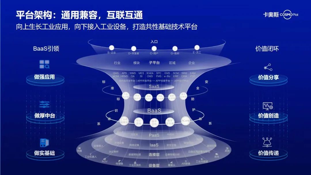 基于海尔30多年的制造业经验,将大规模定制所涉及的工业机理模型、知识图谱、数字空间、数字孪生体等工业知识、经验沉淀为BaaS引擎,向下接入工业设备,形成一个通用兼容的共性基础技术平台,实现从工业基础设施到工业应用的互联互通。