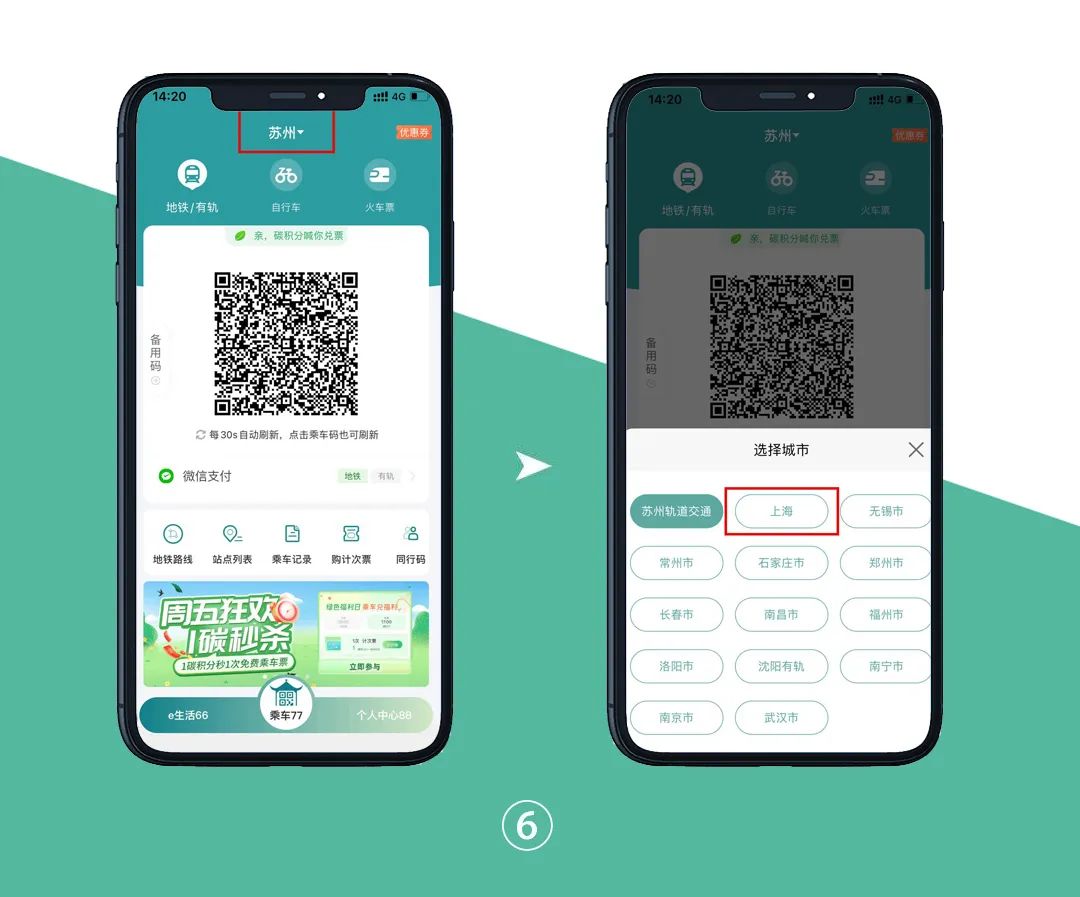 如使用“苏e行”App在上海地铁进站乘车,点击顶部切换城市乘车码,在底部弹出中点击上海,即可乘车。