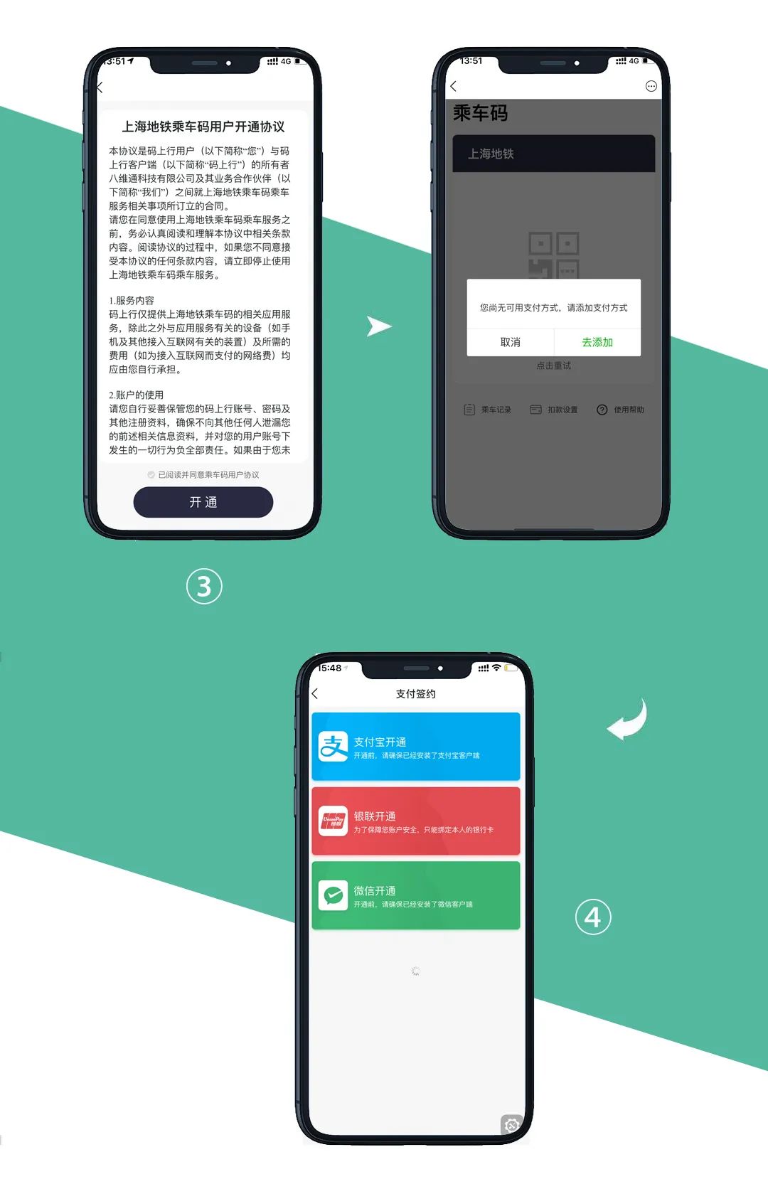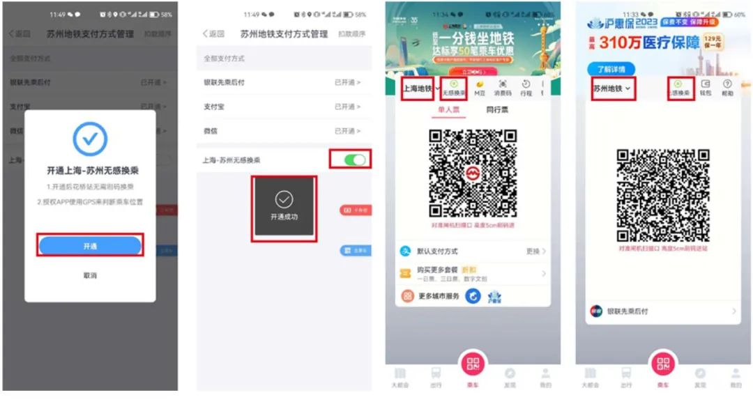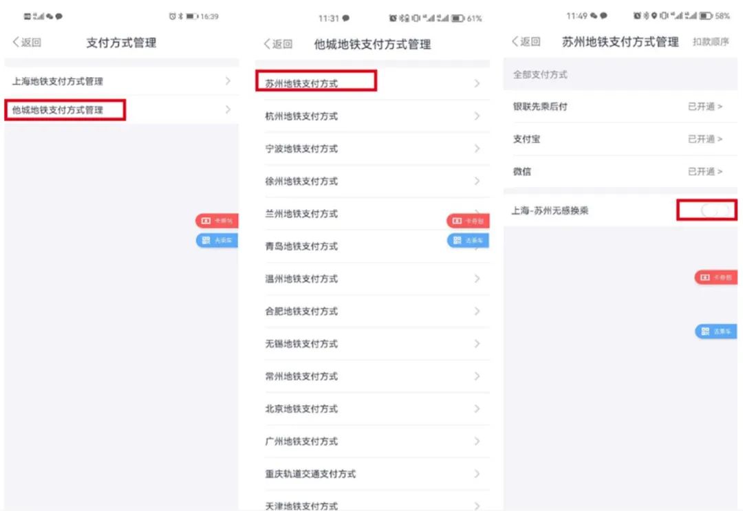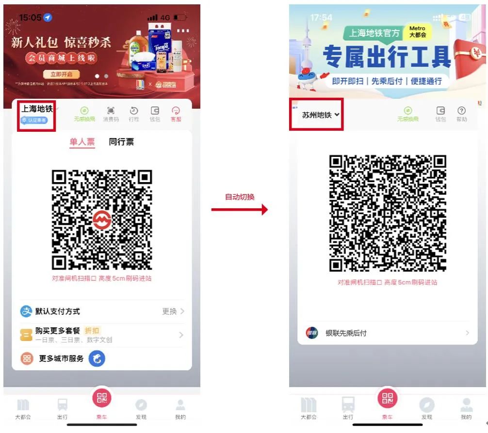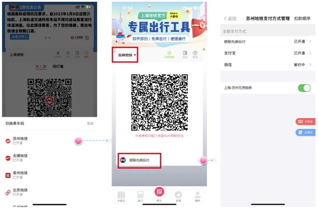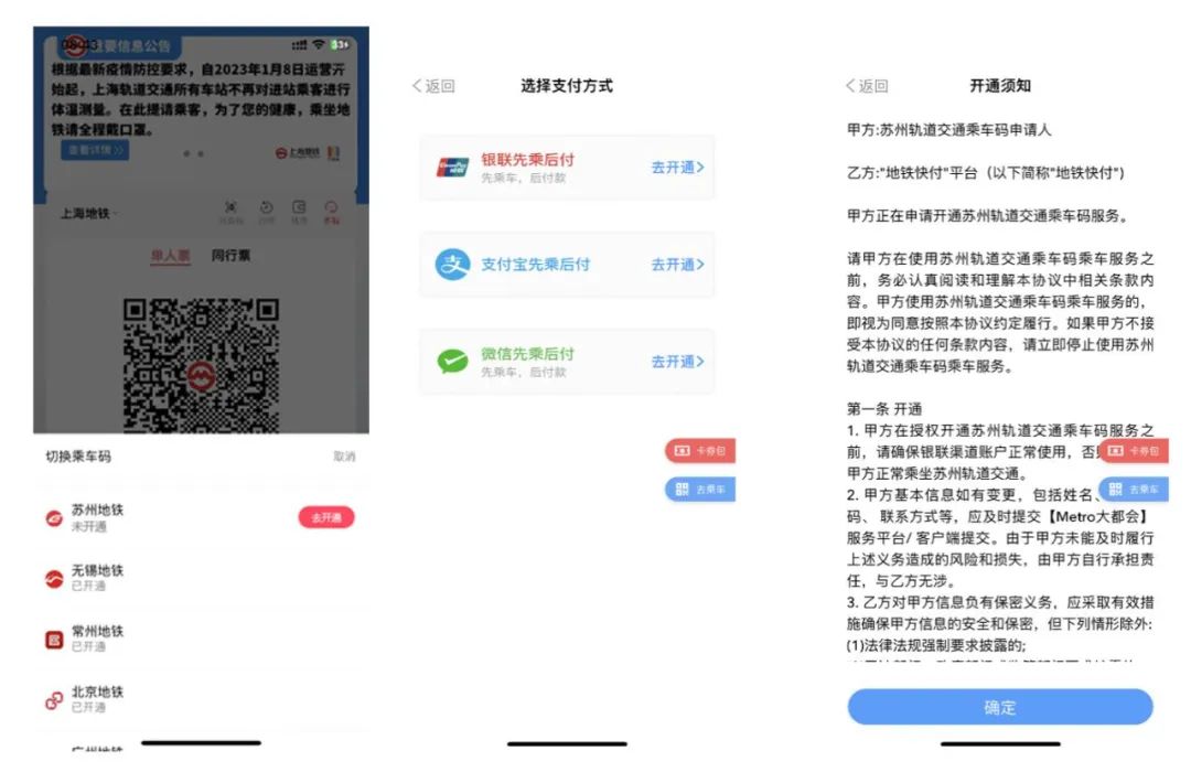 用户从苏州地铁/上海地铁进站乘车,打开“Metro大都会”APP,进入【乘车】页面,点击二维码左上角切换城市乘车码,选择【苏州地铁-去开通】,签约微信、支付宝及银联任一支付方式即可。