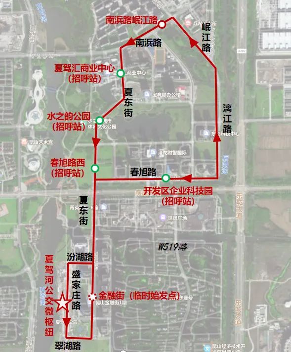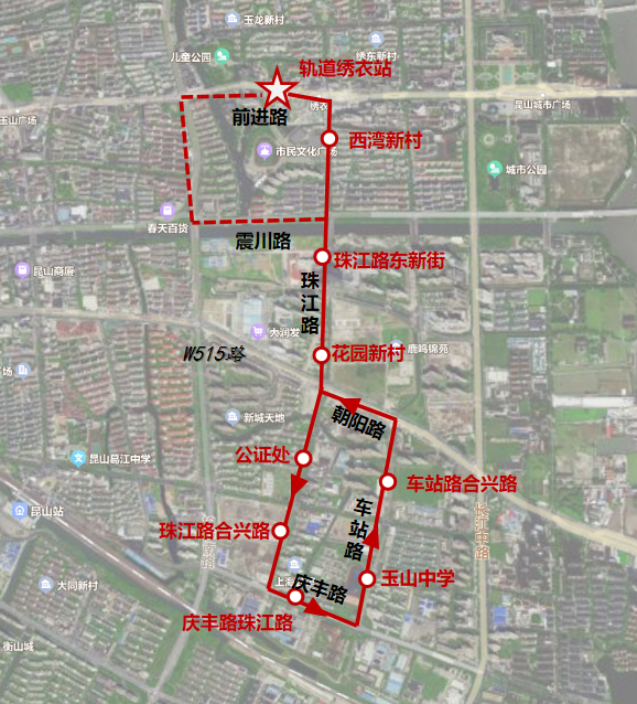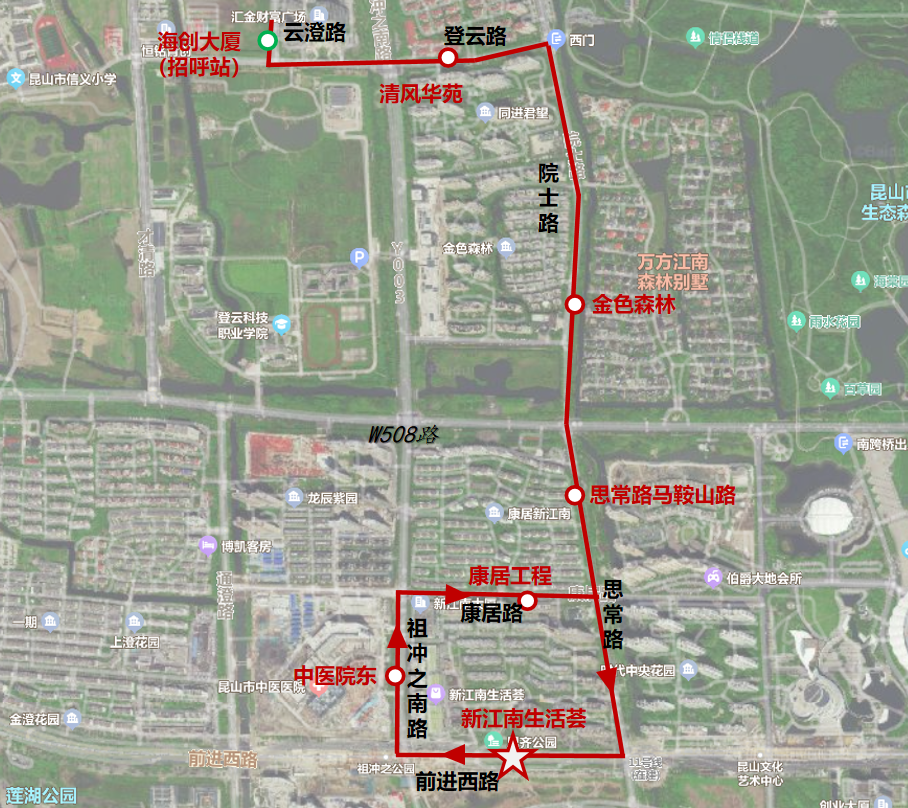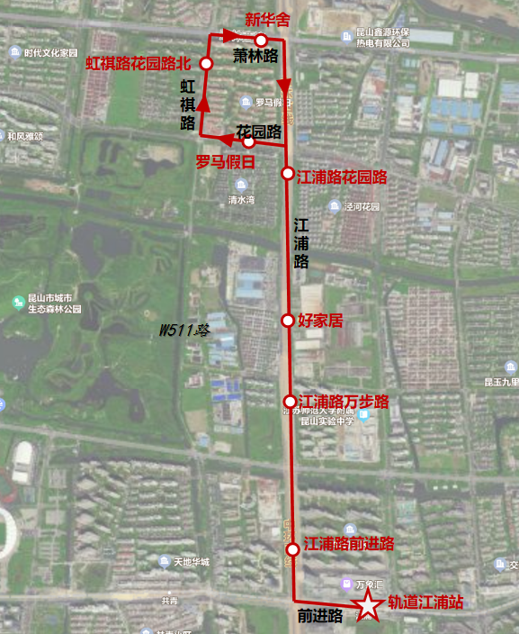 线路走向:昆山南站-小澞河路-九华山路-珑庭路-中华园路-白马泾路-前进路-鹿城路(鹿城路首末站折返)前进路-白马泾路-中华园路-珑庭路-昆山南站