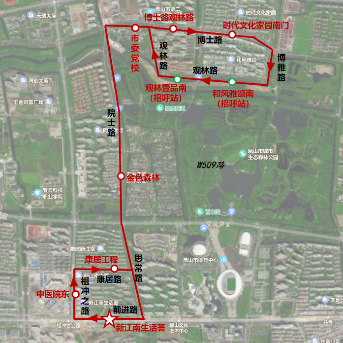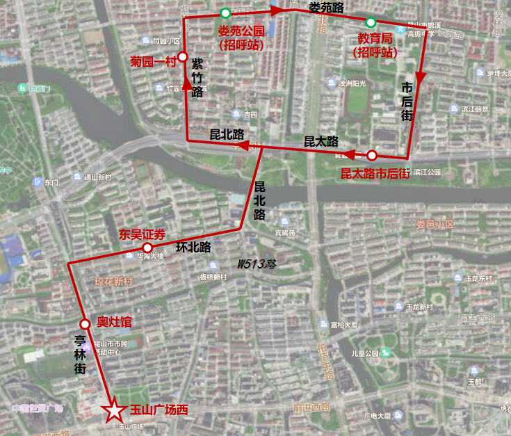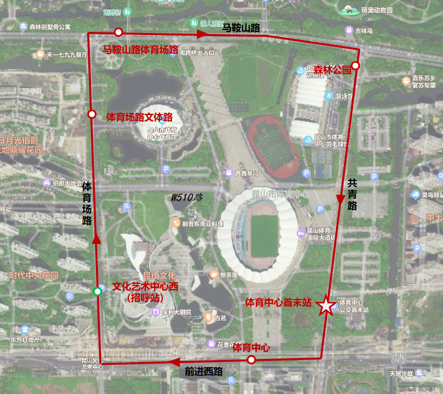 线路走向:亭林路-环城北路-昆北路-紫竹路-娄苑路-市后街-昆太路-昆北路-环城北路-亭林路,单环线模式