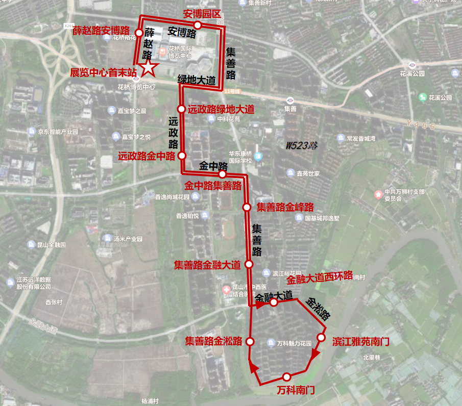 线路走向:薛赵路-安博路-集善路-绿地大道-远政路-金中路-集善路-金融大道-金淞路-集善路-金中路-远政路-绿地大道-集善路-安博路-薛赵路