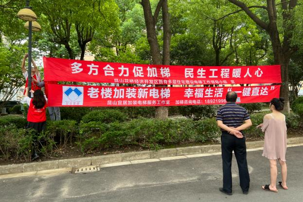 自2022年9月起,花桥增梯办持续加强对小区居民的加梯宣传,通过挂横幅、贴海报、入户宣传等多种方式,努力营造良好加梯宣传氛围。