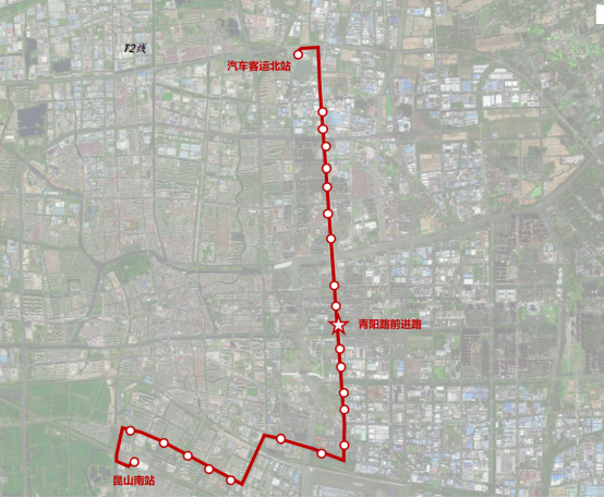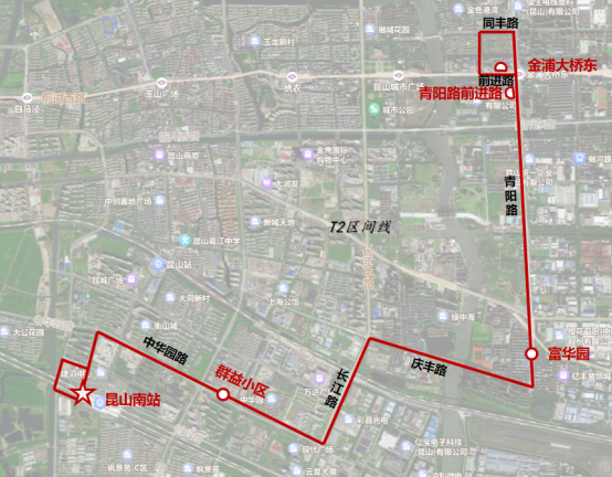 串联苏州轨交11号线金浦大桥东站与昆山南站。市民可乘坐轨交11号线至金浦大桥东站下车,步行130多米至青阳路前进路站,换乘T2线到昆山南站。7月4日起加开金浦大桥东-昆山南站的T2区间线。