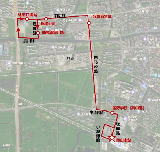 串联苏州轨交11号线白马泾站与昆山南站。市民可乘坐11号线至白马泾站下车,步行200米至超华商贸城站,换乘T1路至昆山南站。