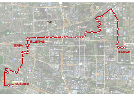 串联苏州轨交11号线绣衣站与昆山南站。市民可乘坐11号线至绣衣站下车,步行220米至珠江路同丰路站或西湾新村站,换乘16路至昆山南站。