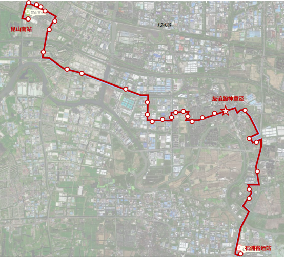 串联苏州轨交11号线神童泾站与昆山南站。市民可乘坐11号线至神童泾站下车,步行400米至友谊路童泾路站,换乘124路到昆山南站。