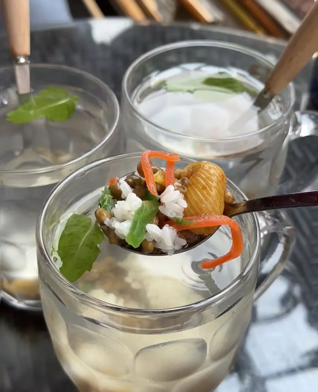 △绿豆粒粒分明,软而不破的绿豆做底、加上一勺雪白的糯米饭,蜜枣、金桔、红豆,色泽缤纷的配料在微微冒泡的薄荷水中显得赏心悦目。光是端起透明玻璃杯欣赏一番它的“美颜”,暑气就已消了大半。