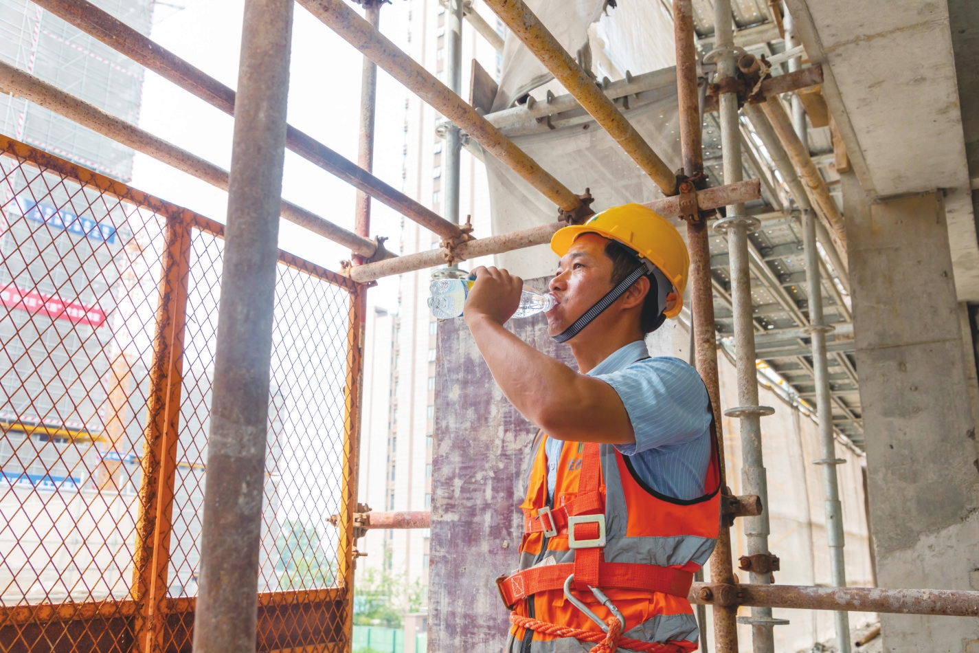 上午9点,气温逐渐升高,没风的时候,狭窄的水泥隔间里特别闷热,空手站着的记者衣裤都不知不觉汗湿了,工人们额头滴落的汗珠越来越密集。此时,洪加春已经完成10个立方的混凝土浇筑,这是全天一半的工作量。他和工友们来到工地门口搭设的凉亭歇会儿,脱下安全帽,解开安全马甲,让汗流浃背的身体透透气,举起冰凉的盐汽水“咕咚咕咚”大口灌下去。“公司给我们配足了盐汽水、纯净水、大麦茶,还有清凉油、风油精。”他扔掉手里的空瓶子说,“保证身体水分是防暑头等大事,这些天太阳越来越厉害,中午下午身上汗都没干过,我一天能喝掉四五升水。”