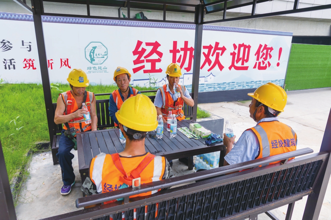 上午10点,阳光越来越热辣,洪加春和工友们下班了。根据市住建部门的部署,昆山市经协建筑装潢有限责任公司对夏季的施工安全特别用心,为了避开高温下干活的中暑危险,从六月底就开始实行错峰施工。“上午6点开工到10点就休息,然后,11点吃午饭,午休可以好好的休息两个小时,到下午2点干活到傍晚6点。”工作的间隙,洪加春对记者说,“现在吃得好睡得好,宿舍都有空调吹,有这么好的条件,我们只想着把手里的活干得漂漂亮亮,让动迁老百姓能住上漂漂亮亮的好房子。”