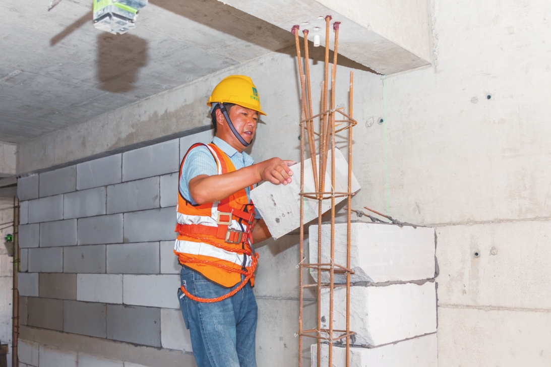 短暂休息后,重新回到工地,洪加春还要完成一部分砌墙任务。作为房间隔断墙用的灰白色砌块砖,六十公分长,二十公分宽和高,一块砖近三十斤重。牢牢抓起沉重的大砖,稳稳地摆在墙上,再用瓦刀刮起泥灰均匀涂抹在砖面上,比照着激光水平仪射出的绿色光线,细心地调整了砖的横平竖直。他说:“砌墙是工地上的技术活,横向和纵向都要平直到位,忙归忙、快归快,标准误差不能超过3到5毫米,要不墙就砌歪斜了。”