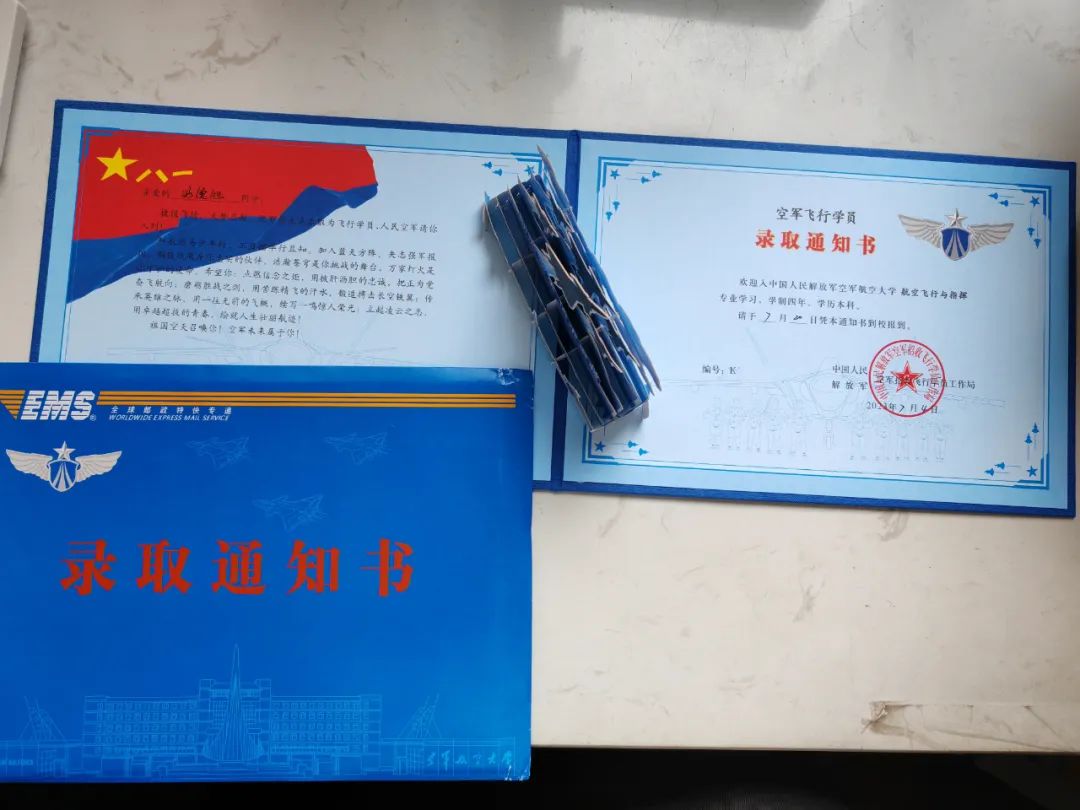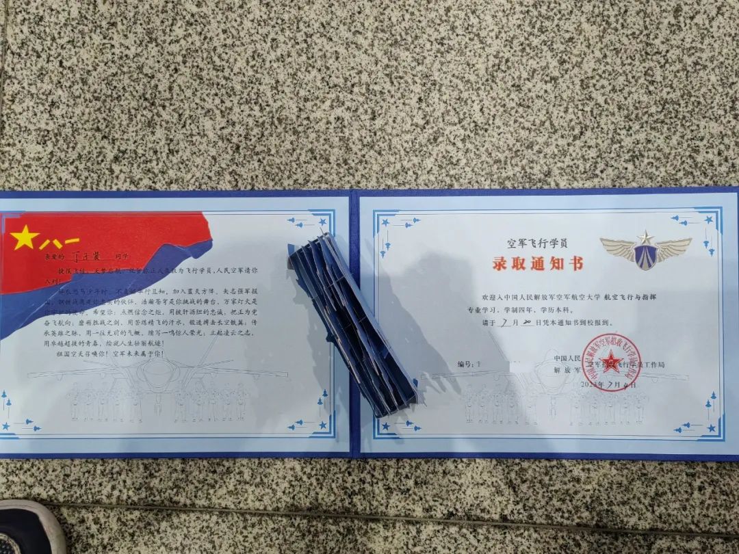 “很早就知道录取的消息,但真正收到录取通知书的那一刻还是非常激动的。尤其是看到通知书上‘祖国空天召唤你,空军未来属于你’这句话让我热血沸腾!”冯德旭说,决定从军并不是一时兴起,由于爸爸有从军经历,让他从小对纪律严明的部队生活心生向往,也希望在这样的环境中历练自己的意志品质,为国家繁荣昌盛、人民幸福安康贡献自己的青春力量。