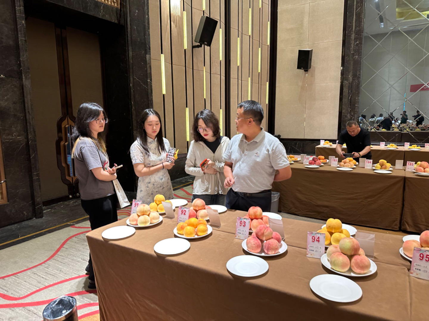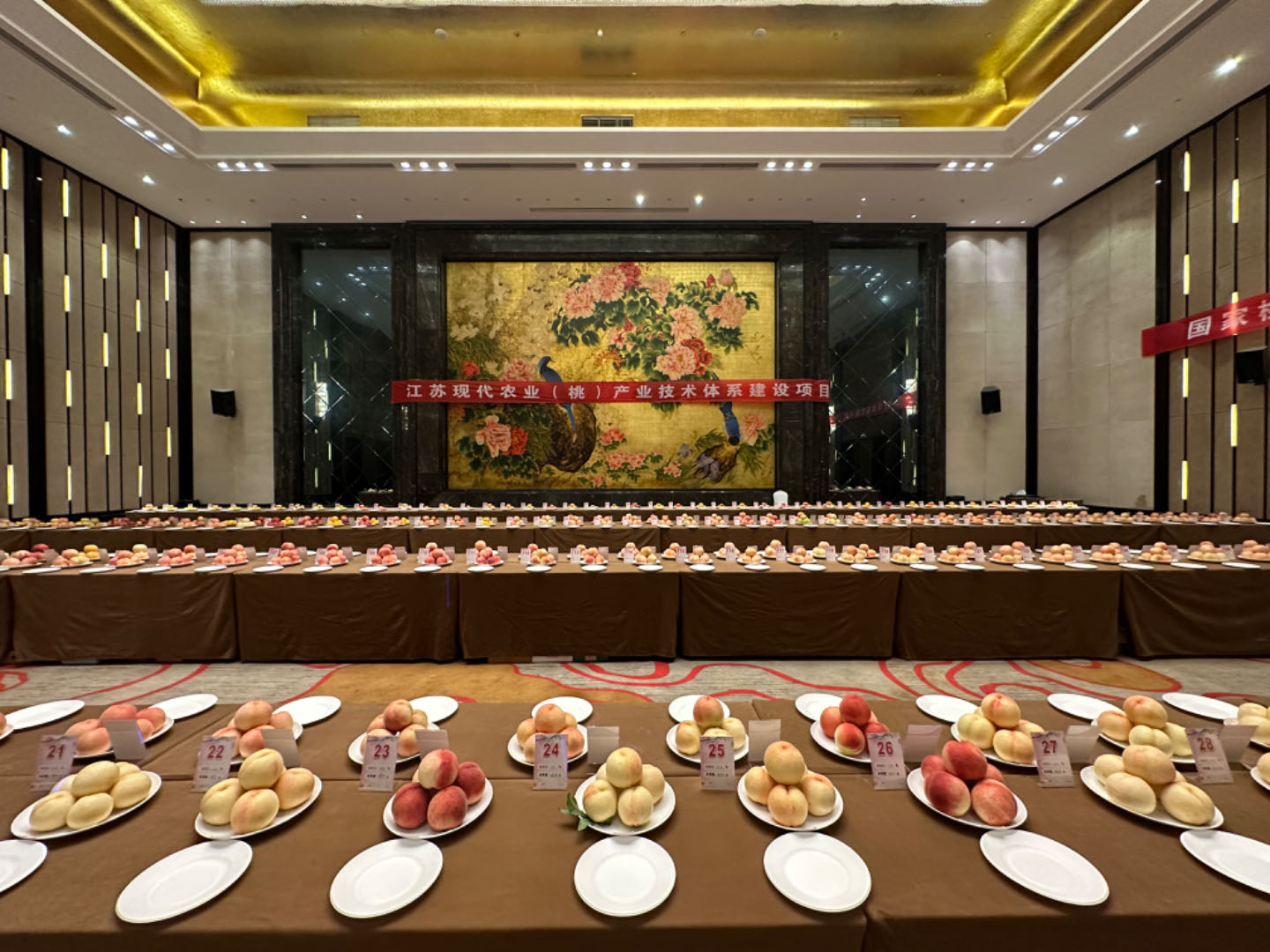 在泗阳赛桃会评比现场,66个品种、315份桃品整齐排列,甜香扑鼻,评委们拿着小本边品尝边打分。