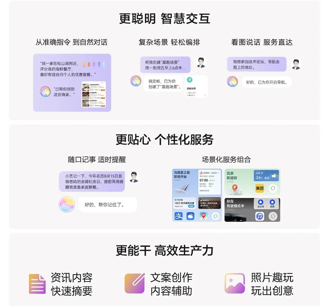 8月4日,华为正式发布了HarmonyOS4。鸿蒙4系统带来多项技术的全新升级,其中最引人关注的便是融合了大模型技术的“升级版”AI小艺。作为首个具备AI大模型能力的智慧助手,小艺可以通过对自然对话的理解,识别出用户的意图,很多操作不需要专业术语表达,小艺便可以明白并执行。