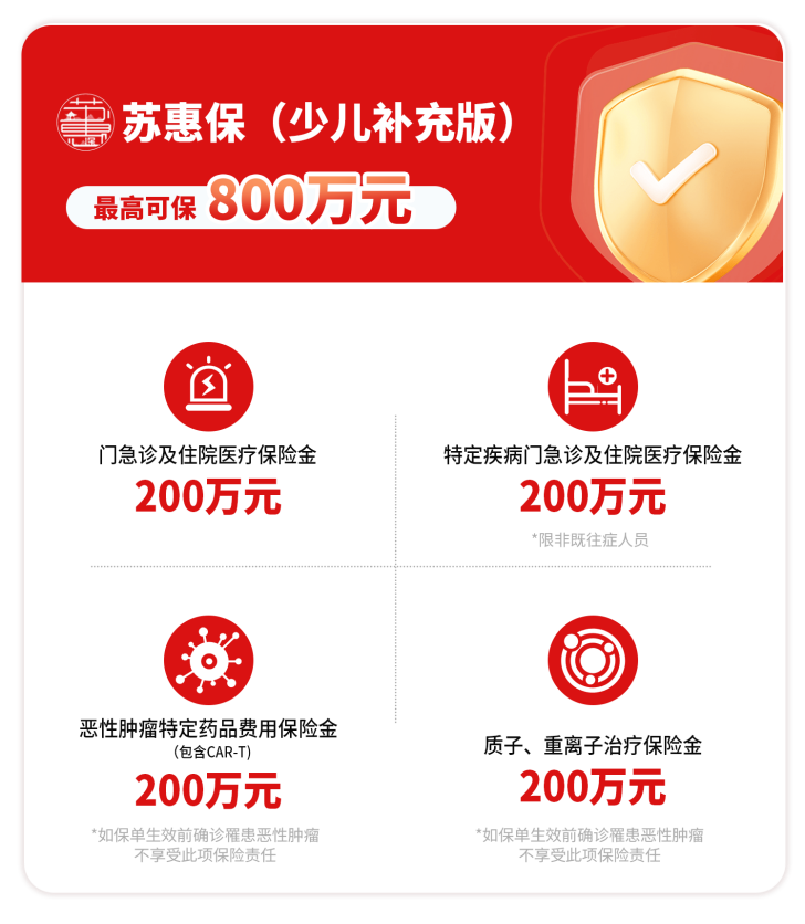 苏惠保(少儿补充版)保障覆盖门急诊、住院、特定疾病、特药、质子重离子等医保内外责任,保障全面更安心。