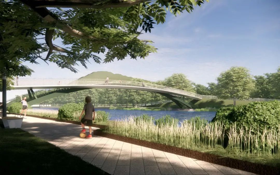 作为庙泾河环城滨江绿色廊道的关键一环,河心岛北跨桥及西跨桥在保护庙泾河和亭林园既有生态风貌的基础上,增强老城区与城西、城北区域的融合度。