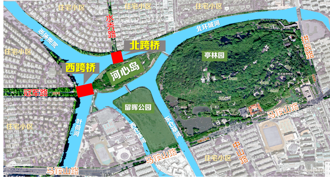 亭林园西侧的河心岛四面环水,北面紧邻南北向而来的水秀路,西面紧邻东西向而来的冠军路。为方便广大市民从西侧、北侧进入亭林园游览,河心岛北跨桥与西跨桥工程于2022年12月开工。