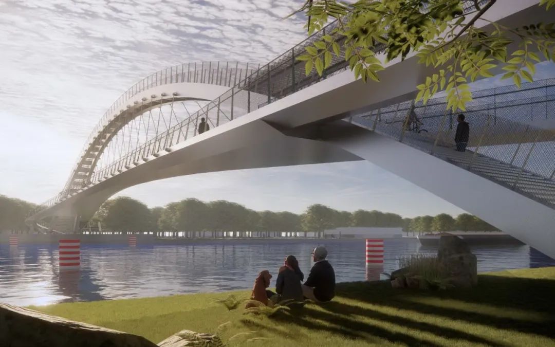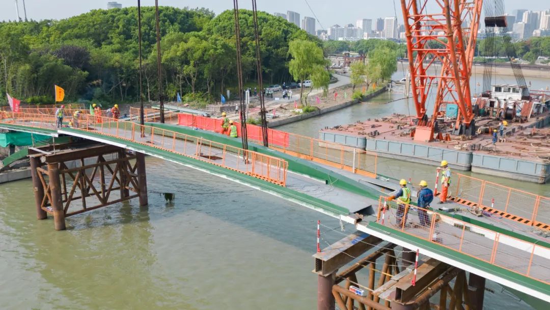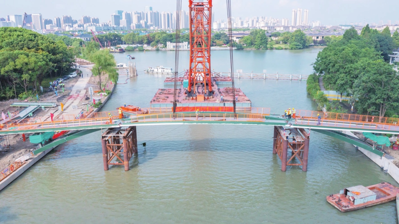 亭林园河心岛北跨桥顺利合龙,预计今年10月竣工投用