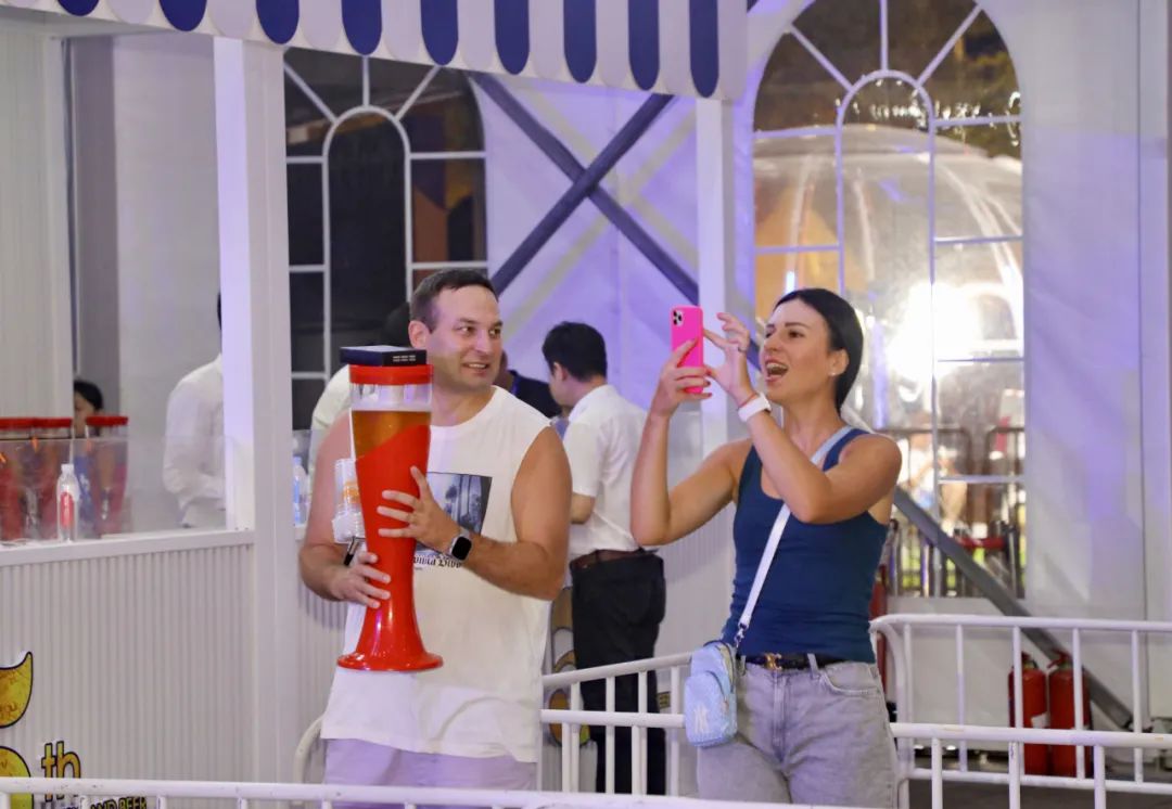 啤酒节现场设置了可以同时容纳4000人的慕尼黑HB啤酒、青岛啤酒两座啤酒大棚,烤串、小龙虾、海鲜等美食摊位以及采芝斋、诺丁顿咖啡、日世冰激凌等地方特色品牌摊位,可谓是拿出了满满的诚意,让市民群众有得吃、有得饮、有得看、有得玩,既点亮夜经济,又激发文旅消费活力。