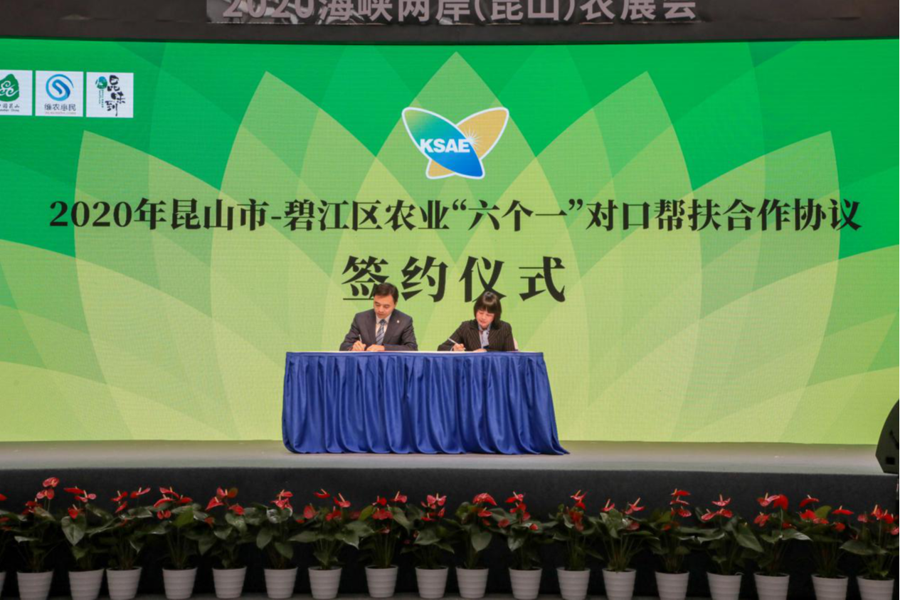 11月20日,“梵净山珍·健康养生”贵州省铜仁市碧江区优质农产品推介会在昆举行。这是昆碧结对以来碧江农产品第三次走进昆山,也是连续第三年举办农业专场推介会。推介会上,昆山与碧江签订《2020年昆山市-碧江区农业“六个一”对口帮扶合作协议》,昆山市优来谷成科创中心、昆山市圩田农业科技有限公司等6家经销单位与碧江区锦程集团、碧江区碧园鲜农产品销售公司进行了“碧江农产品+昆山市场”经销合作签约。铜仁市人大常委会副主任、碧江区委书记陈代文,碧江区副区长黎明;昆山市委副书记张月林,副市长李文出席推介会。