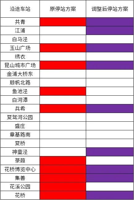 根据11号线开通后的客流情况及乘客意见建议,早晚共青与花桥之间的大站快车停靠站点调整为:共青、江浦、玉山广场、昆山城市广场、兵希、神童泾、花桥博览中心、集善、花桥,调整后大站快车旅行时间将进一步缩短。