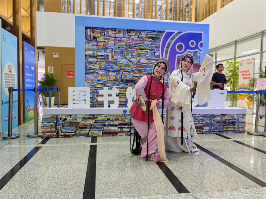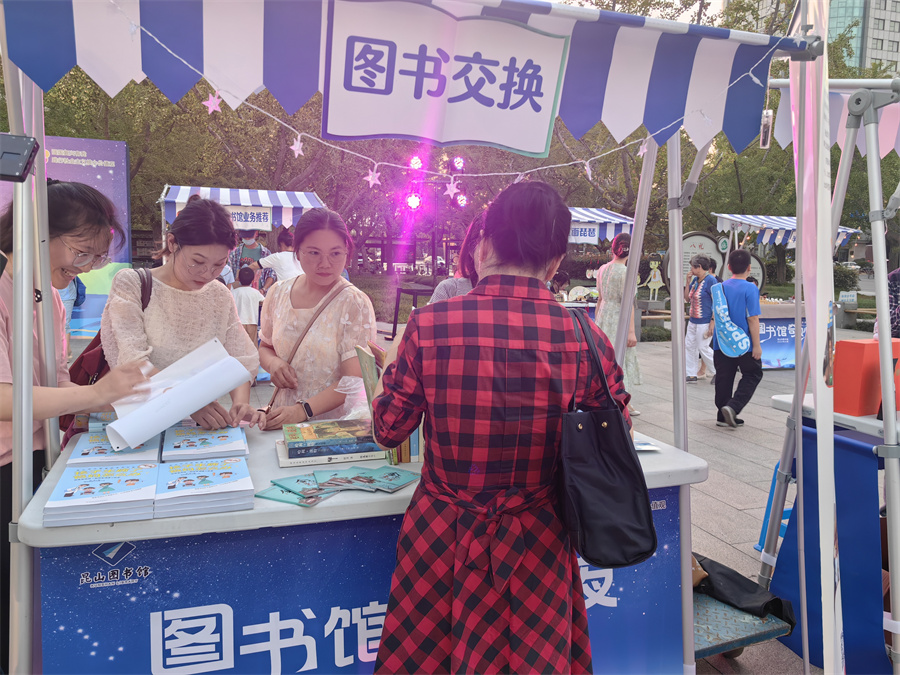 夜晚的市图书馆人头攒动,大厅内,一个由各类书籍改造、组合而成的“图书艺术造型”吸引了读者们的眼光,打卡留念的同时,大家也如“寻宝”般仔细搜寻着自己喜爱的书籍。广场的文艺集市里,有的带着家中闲置的书籍到图书交换摊位置换心仪的图书,有的到印象百戏、玉面琵琶等文创摊位感受传统文化的创新转变。现场,昆曲表演、诗词大冲浪等活动吸引了大小朋友的热情参与,大家置身其中,体验穿梭古今之感。