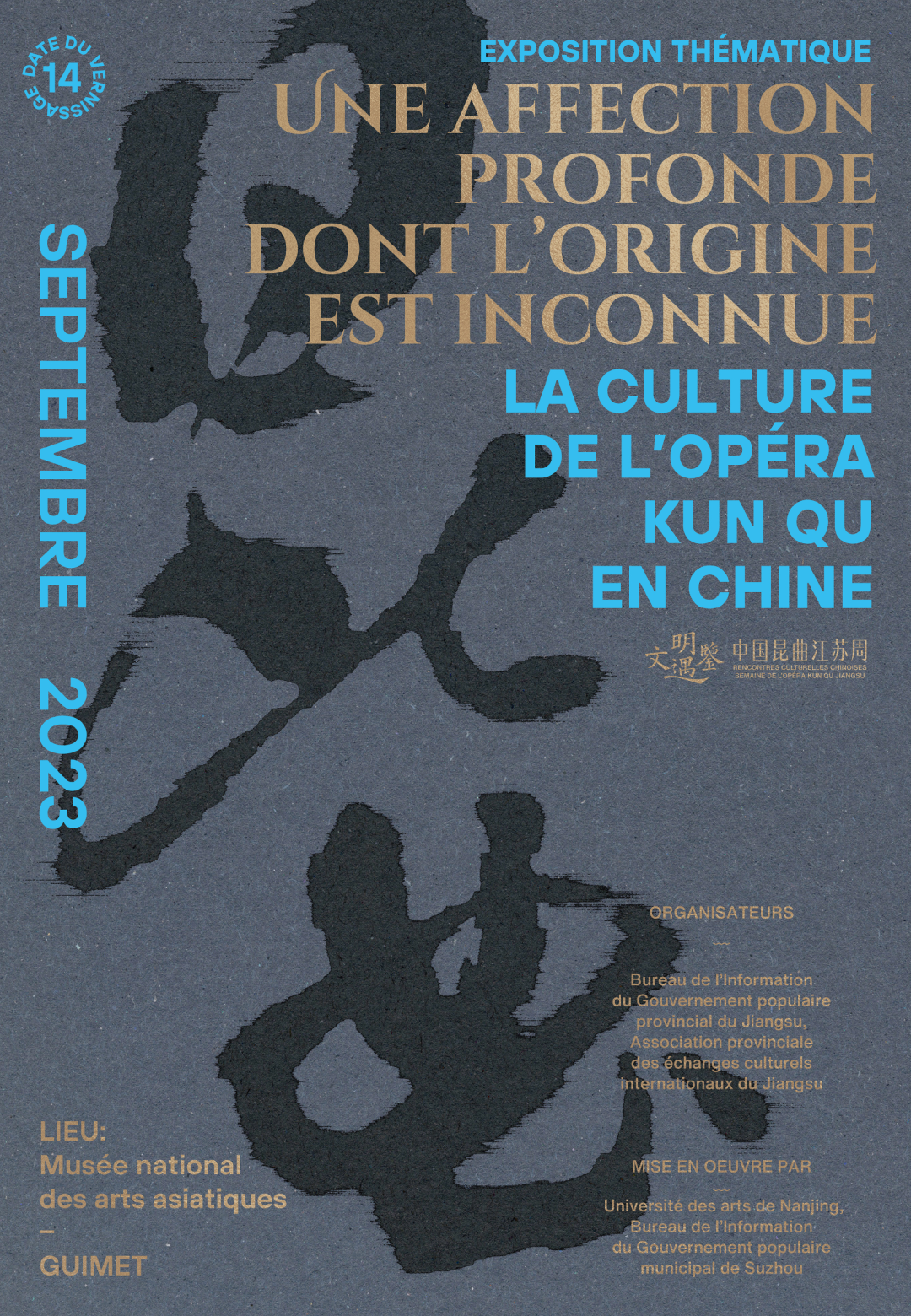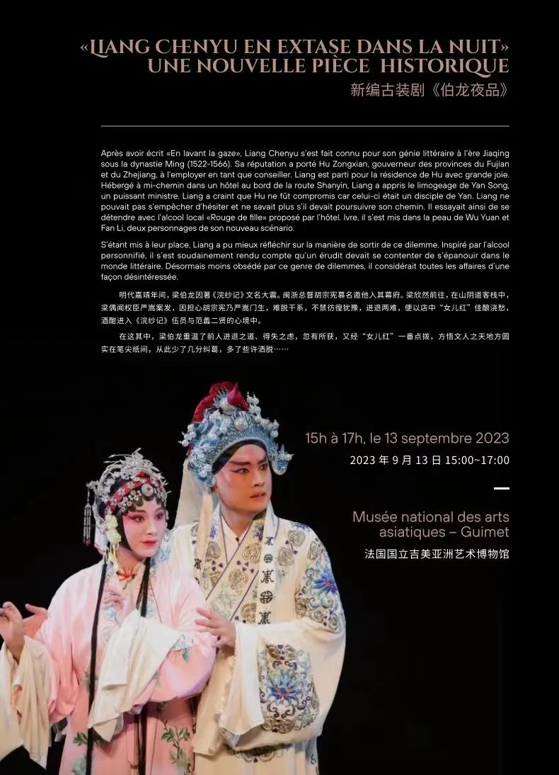 9月13日、14日,在法国吉美国立亚洲艺术博物馆举办“情不知所起,一往而深:中国昆曲文化专题展览”,全方位展示昆曲的历史、文本、道具、服饰、器乐、对外交流等,呈现中华文化传承发展和中国式现代化江苏新实践图景。