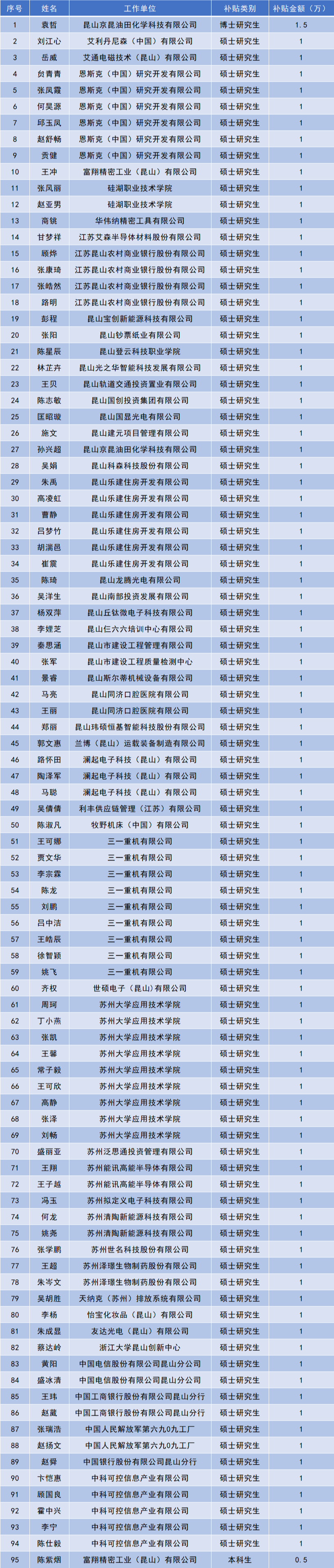 根据《昆山市产业人才计划实施办法(试行)》(昆政发〔2018〕3号)和《昆山市高校毕业生人才计划实施细则(试行)》(昆人社发〔2018〕7号)要求,经申报、受理、汇总、审核等程序,共95人符合高校毕业生一次性租房和生活补贴发放条件,现将拟资助名单予以公示。