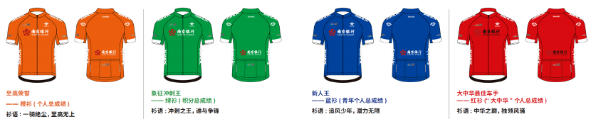 橙色领骑衫代表个人总成绩最高荣誉,绿色领骑衫是冲刺王的象征,本赛段橙衫和绿衫获得者是ZANONCELLO Enrico;蓝色领骑衫代表青年个人总成绩第一名,获得蓝衫的是VAN DE PAAR Jarne;红色领骑衫代表大中华最佳车手,红衫获得者是姜治慧。