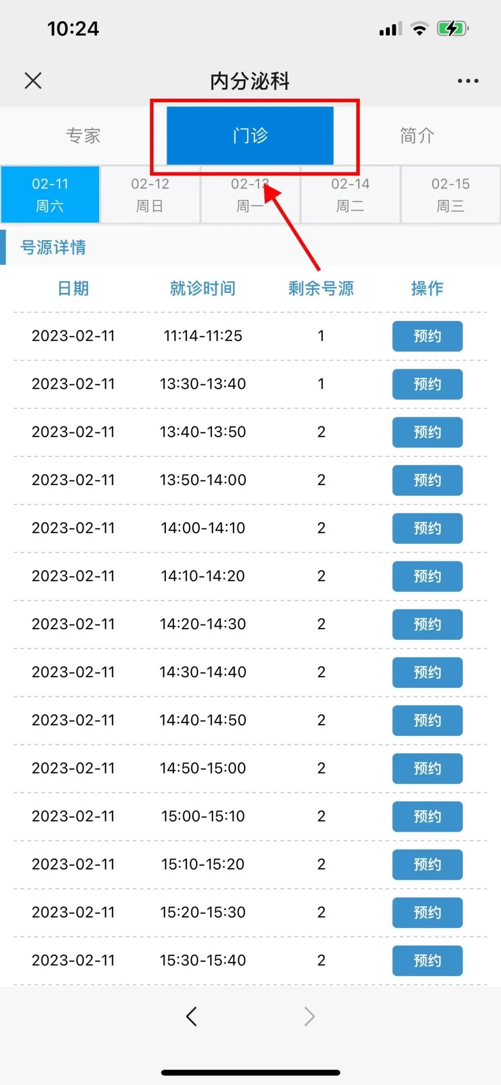 第五步:点开“门诊”,选择合适的时间段进行预约。